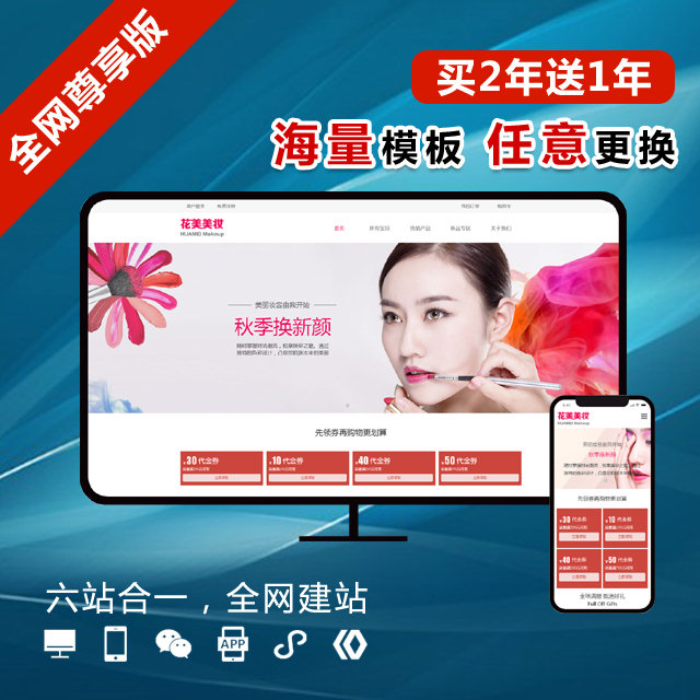套餐包含:PC 网站、手机站、微站、APP、百度小程序、微信小程序。六站合一,全网建站套餐;海量模板,任意更换。