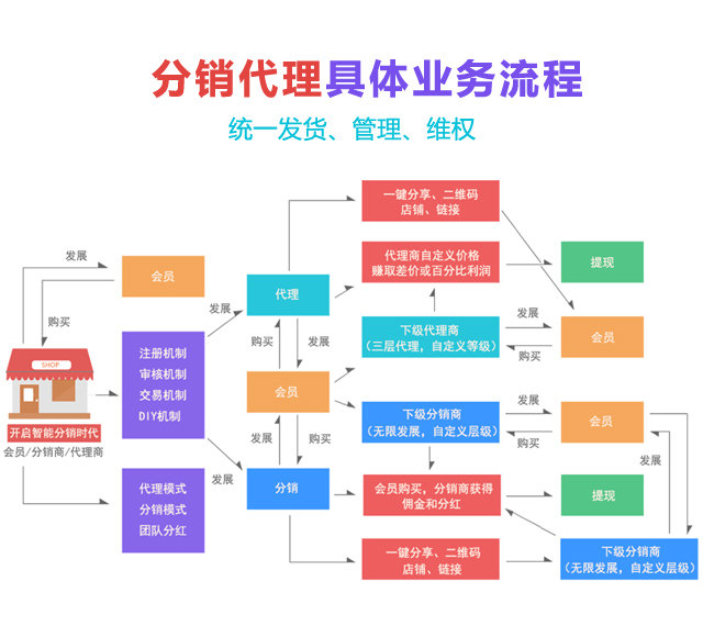 一键分销,无限开分店,三级返佣,销售网络快速裂变。网站集购物、分销、支付、文章(新闻)、产品、会员、营销活动等功能模块。